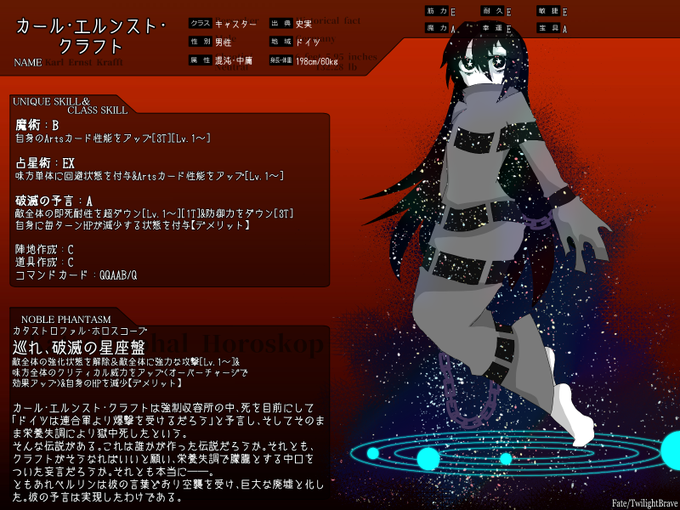 この時弾圧された占星術師には 先述のカール エルンスト クラフト までが含まれていた 彼はナチスの敗北を口にし始めていたので 周囲から警戒されていたのだ ナチスに協力した天才占星術師 カール エルンスト クラフト 彼はブッヘンヴァルト収容所へ 送られる途中死亡した 44. カール エルンスト クラフト 元ネタ 史実 class キャスター マスター 真名 カール エルンスト クラフト 性別 男性 身長 体重 176cm 63kg 属性 中立 中庸 ステータス 筋力e 耐久e 敏捷e 魔力c 幸運d 宝具d クラス別スキル 陣地作成 c 魔術師として 自らに. カール エルンスト karl ernst 1904年 9月1日 1934年 6月30日 は ドイツの政治家 国家社会主義ドイツ労働者党 ナチス党 の突撃隊 sa 幹部 長いナイフの夜の際に粛清された人物の一人.