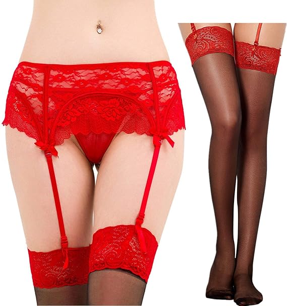 Amazon Co Jp Ohyeahlady レディース ガーターベルト 黒 赤 網タイツ レース シースルー コスブレ ガーター セット パンティーストッキング Cストリング 大きいサイズ 服 ファッション小物