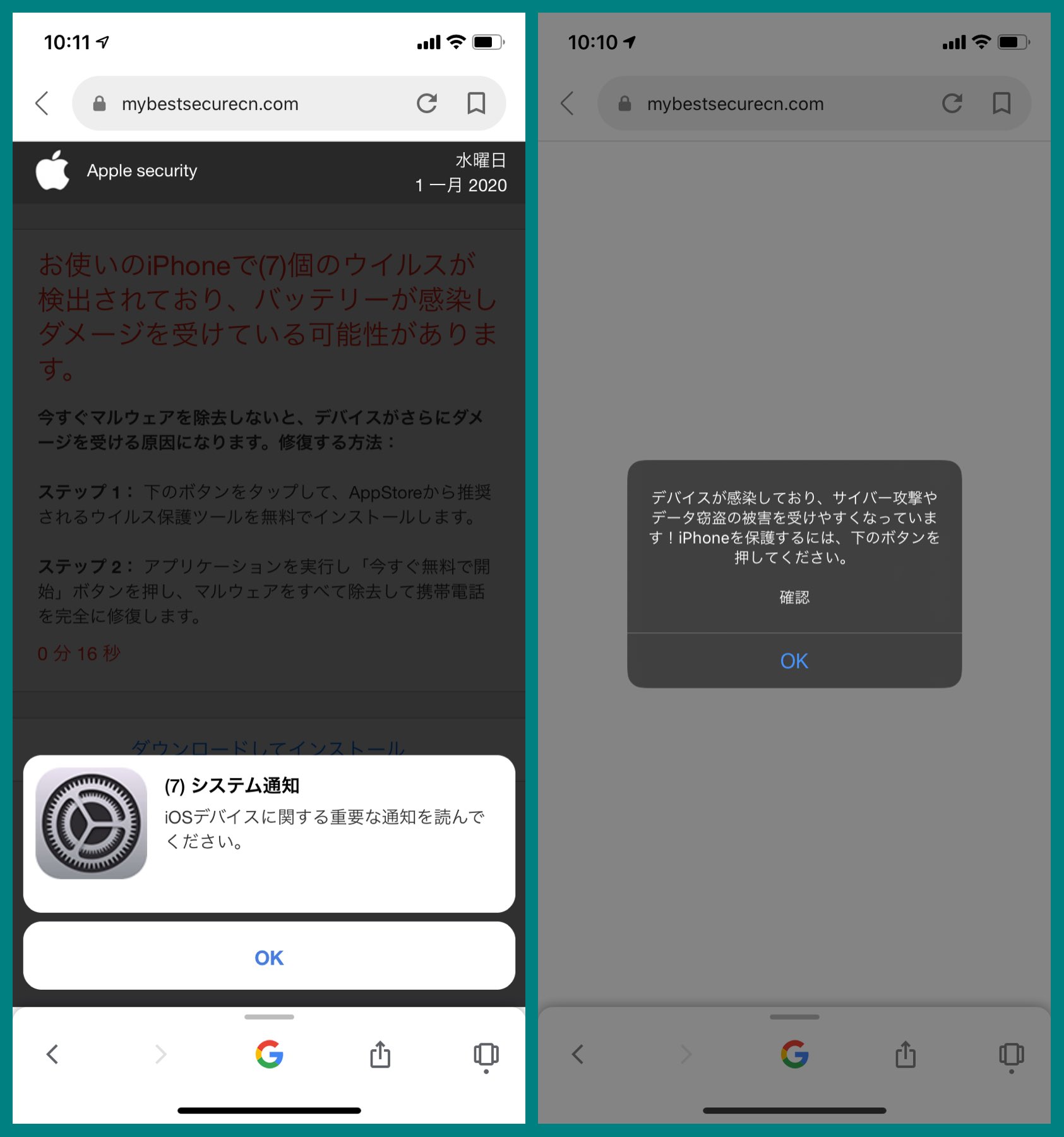 Atsushi Boulder On Twitter デバイスが感染 サイバー攻撃やデータ窃盗被害 のポップアップダイアログ Apple Security 7 システム通知の画面下にお使いのiphoneで 7 個のウイルス検出 バッテリーが感染ダメージを受けてる 今すぐマルウェア除去 正月元旦からvpn